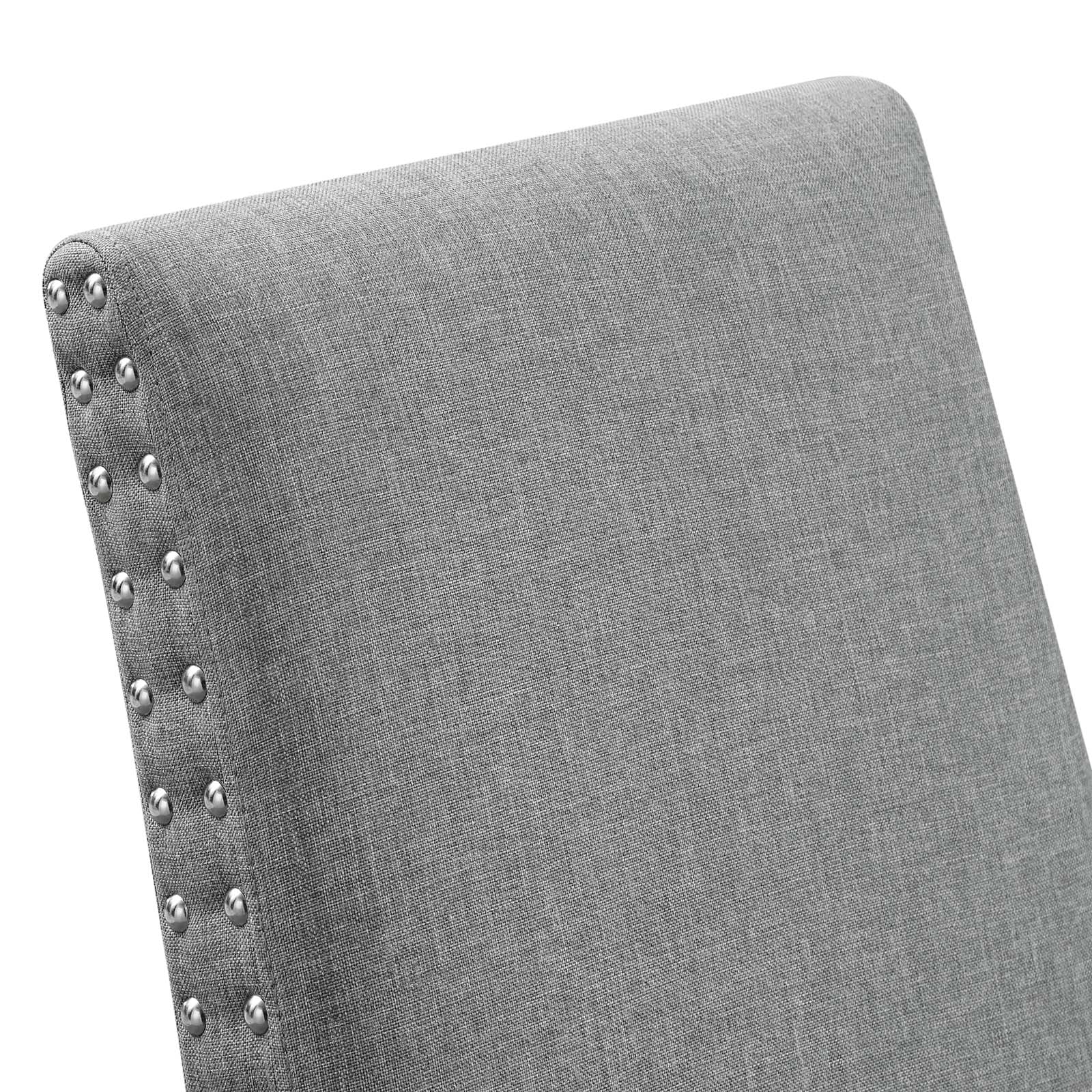 Wrap up moments of quality seating with the Parcel Upholstered Fabric Dining Room Side Chair. Finely upholstered in soft and durable fabric polyester upholstery with elegant nailhead trim, the Parcel Accent Chair delivers a modern offering that enhances the dining room experience. Padded with dense foam and supported by espresso stained tapered wood legs, the Parcel Dining Chair is a stylish addition to your dining room, living room, lounge room, or office. Chair Weight Capacity: 285 lbs. Assembly Required.