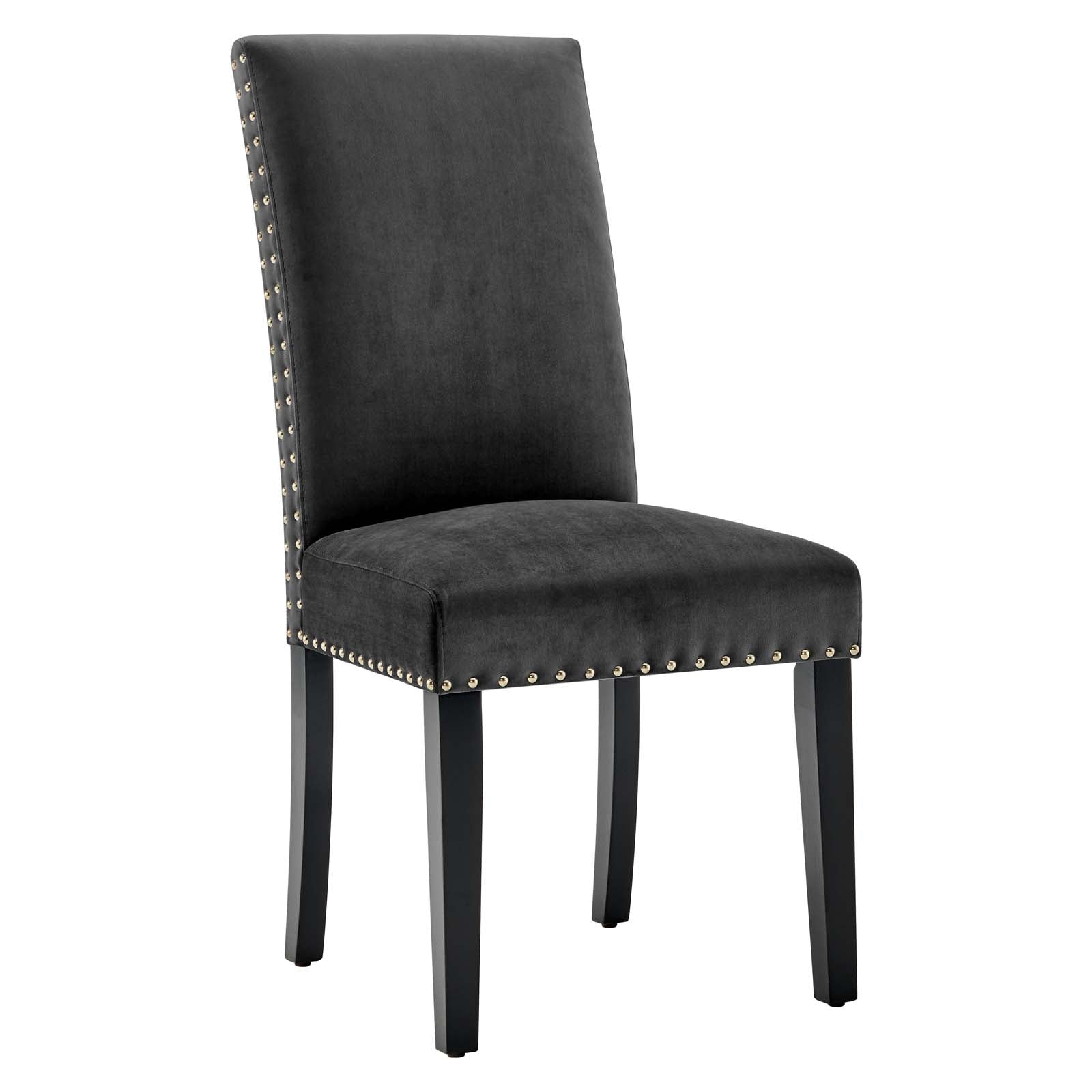 Wrap up moments of quality seating with the Parcel Upholstered Performance Velvet Dining Room Side Chair. Finely upholstered in soft, stain-resistant performance velvet upholstery with elegant nailhead trim, the Parcel Accent Chair delivers a vintage modern offering that enhances the dining room experience in a subtle and unassuming way. Padded with dense foam and supported by solid stained rubberwood legs, the Parcel Side Chair is a stylish addition to your dining room, living room, lounge room, or office. Chair Weight Capacity: 285 lbs. Assembly Required.