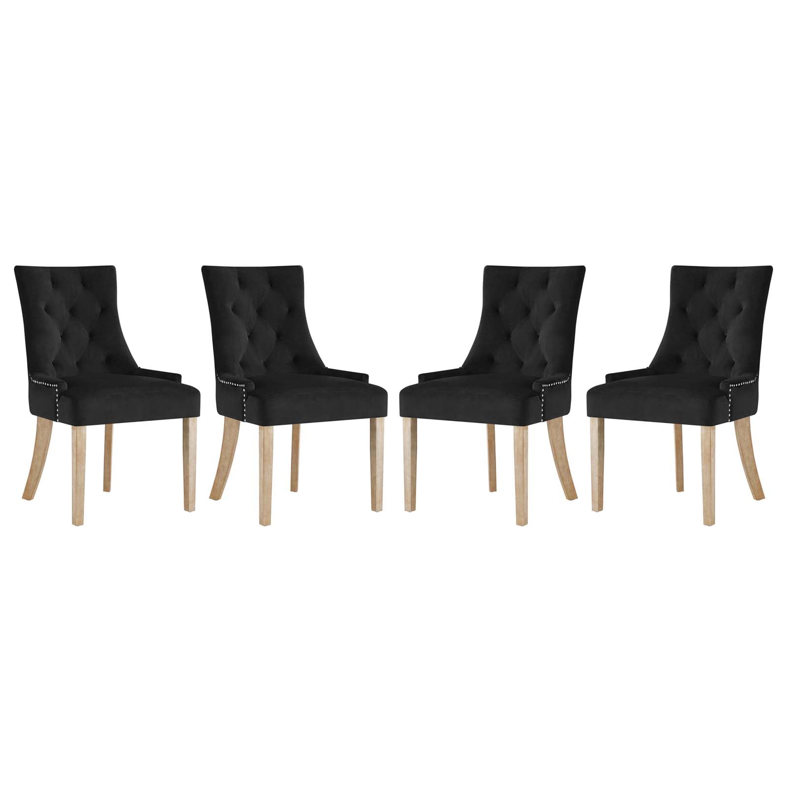 Update your dining room décor with the Pose Performance Velvet Dining Chair Set. Designed with a charming modern farmhouse aesthetic, Pose features elegant tufting, exquisite nailhead trim, padded seat and back with soft, stain-resistant performance velvet upholstery, and a décorative metal ring on the chair back for a delightful finishing touch. Supported by solid natural wood legs with flared back legs and non-marking foot caps, Pose is a distinctive dining chair perfect for the modern home.