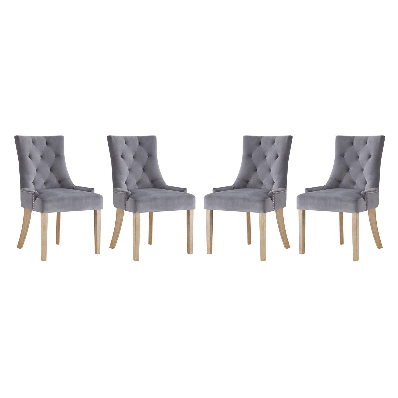 Update your dining room décor with the Pose Performance Velvet Dining Chair Set. Designed with a charming modern farmhouse aesthetic, Pose features elegant tufting, exquisite nailhead trim, padded seat and back with soft, stain-resistant performance velvet upholstery, and a décorative metal ring on the chair back for a delightful finishing touch. Supported by solid natural wood legs with flared back legs and non-marking foot caps, Pose is a distinctive dining chair perfect for the modern home.