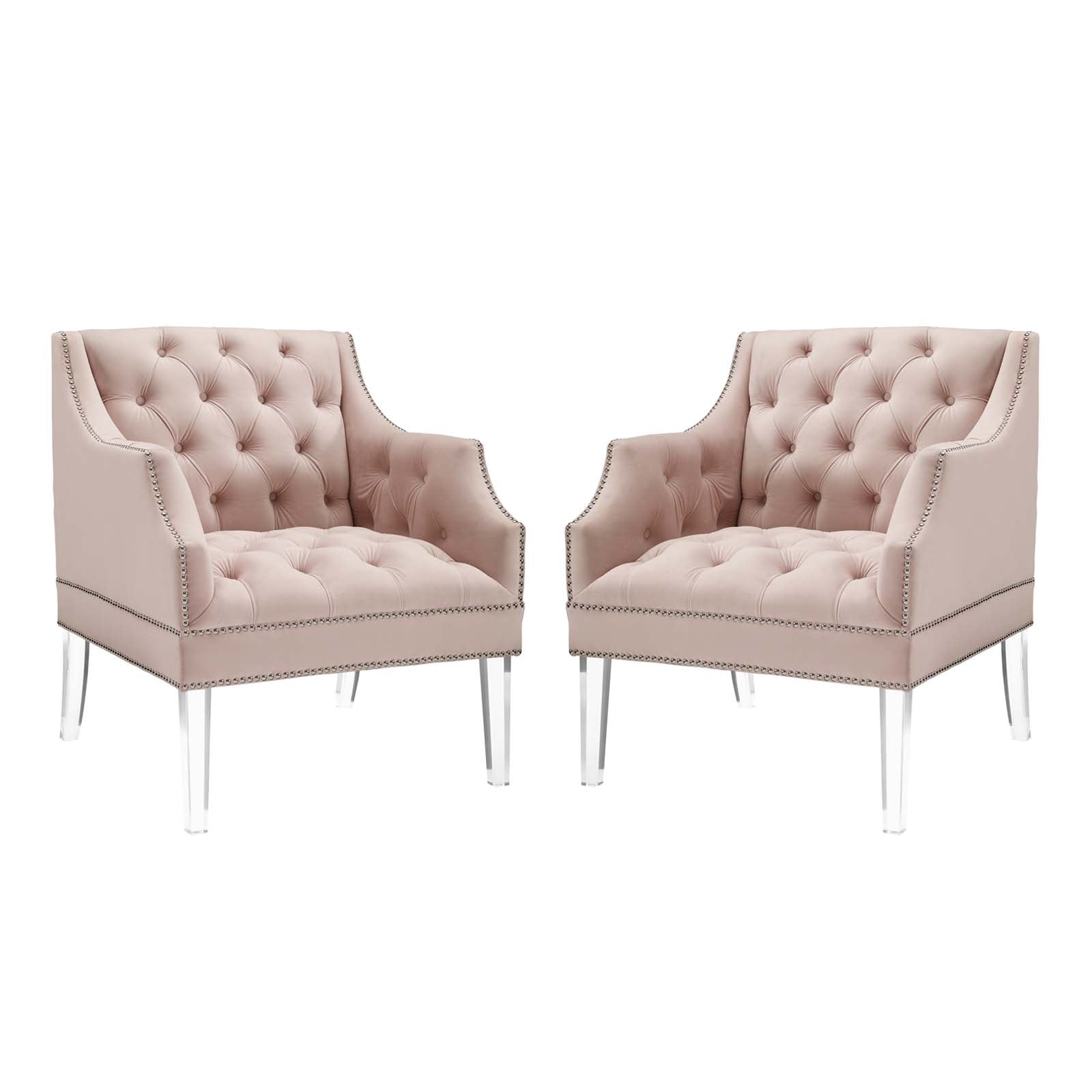 Transform your living room decor with the Proverbial Accent Armchair. The deep button tufting of Proverbial's interior frame combined with four sturdy acrylic legs to add a visionary delight to contemporary decor. Featuring luxurious stain-resistant performance velvet upholstery, and glamorous nailhead trim, Proverbial boasts generous dense foam padding a sinuous spring support system for a premium seating experience. Enjoy your leisure time in this modern accent chair for the living room, lounge room, bedroom, or entryway.