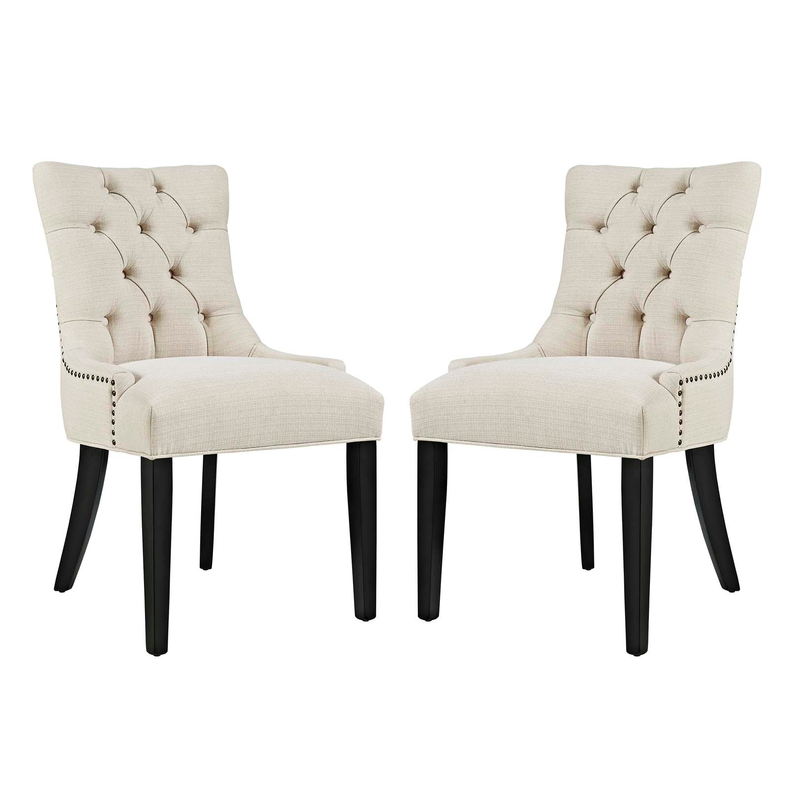 Transport your décor to a simpler time with the Regent Dining Side Chair. Fashioned with a chic and elegant look, Regent features finely tufted buttons, studded nailhead trim, and a regal seat generously padded in foam and upholstered in polyester fabric. Regent comes with non-marking foot caps, tapered wood legs, and works well in both modern and traditional dining rooms.
