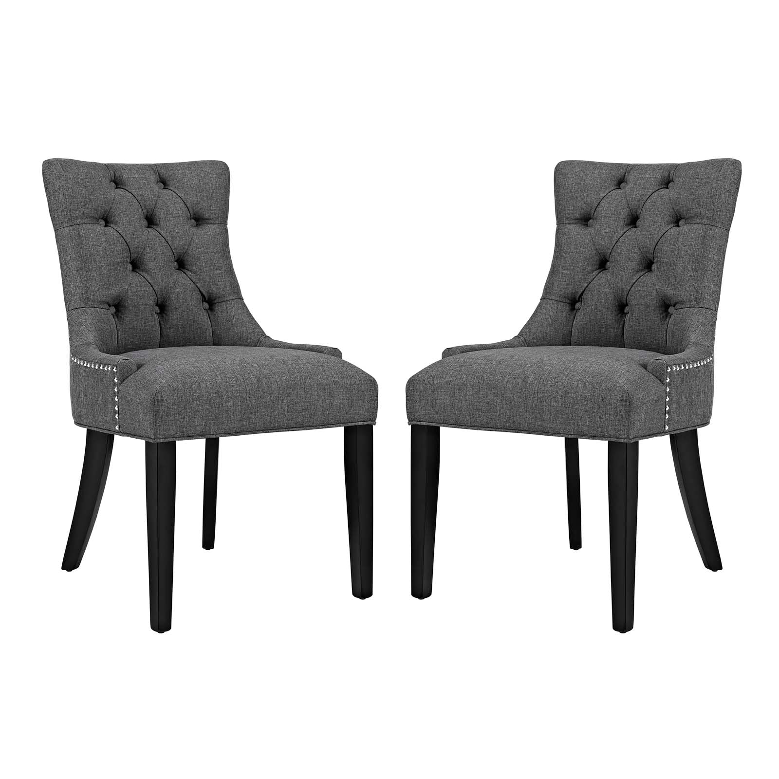 Transport your décor to a simpler time with the Regent Dining Side Chair. Fashioned with a chic and elegant look, Regent features finely tufted buttons, studded nailhead trim, and a regal seat generously padded in foam and upholstered in polyester fabric. Regent comes with non-marking foot caps, tapered wood legs, and works well in both modern and traditional dining rooms.