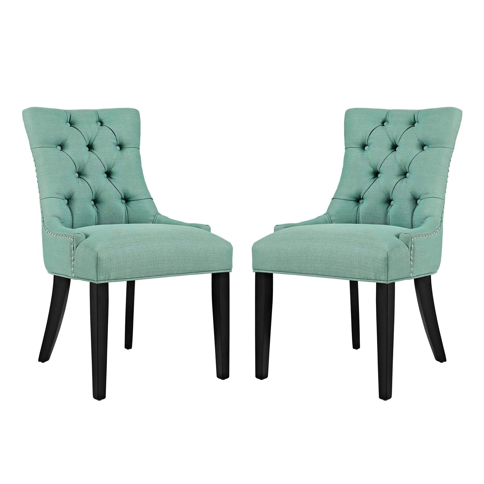 Transport your décor to a simpler time with the Regent Dining Side Chair. Fashioned with a chic and elegant look, Regent features finely tufted buttons, studded nailhead trim, and a regal seat generously padded in foam and upholstered in polyester fabric. Regent comes with non-marking foot caps, tapered wood legs, and works well in both modern and traditional dining rooms.