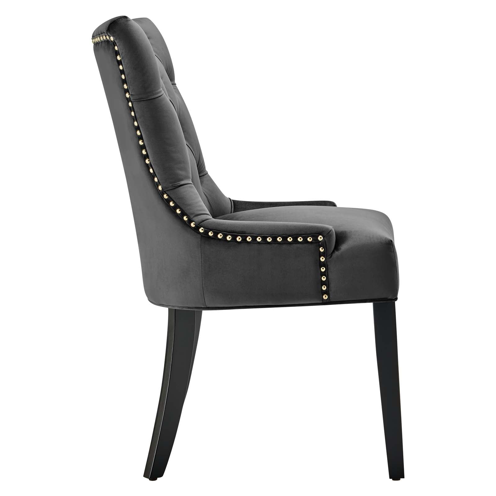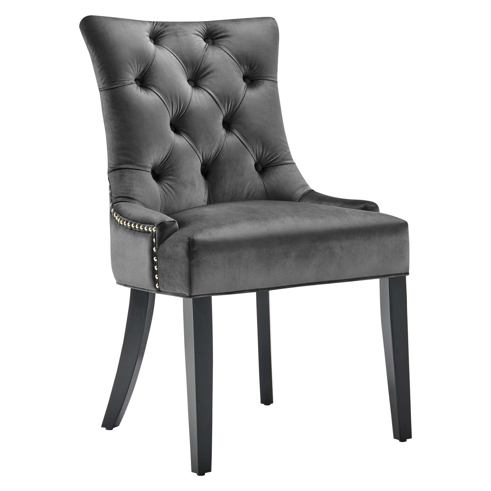 Transport your dining room décor to a simpler time with the Regent Tufted Button Upholstered Performance Velvet Dining Chair. With a chic and elegant look, the Regent Accent Chair features finely tufted buttons and studded nailhead trim that enhance any dining room, living room, lounge room, or office decor with timeless elegance. The Regent Dining Chair has a seat generously padded with foam and a spring coil system with webbing for long-lasting comfort. Covered in stain-resistant performance velvet upholstery, the Regent Dining Room Side Chair comes with non-marking foot caps, tapered wood legs, and is a masterful choice for modern and traditional dining and living rooms. Chair Weight Capacity: 500 lbs.