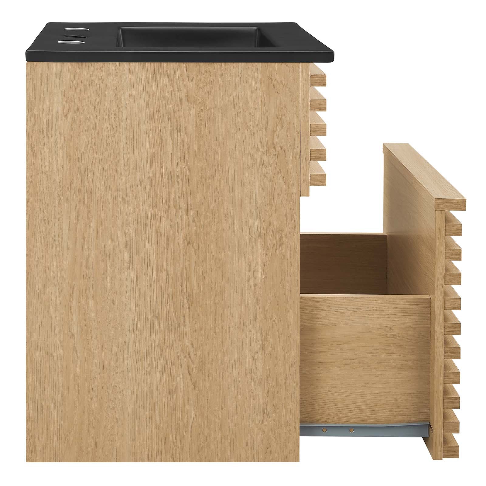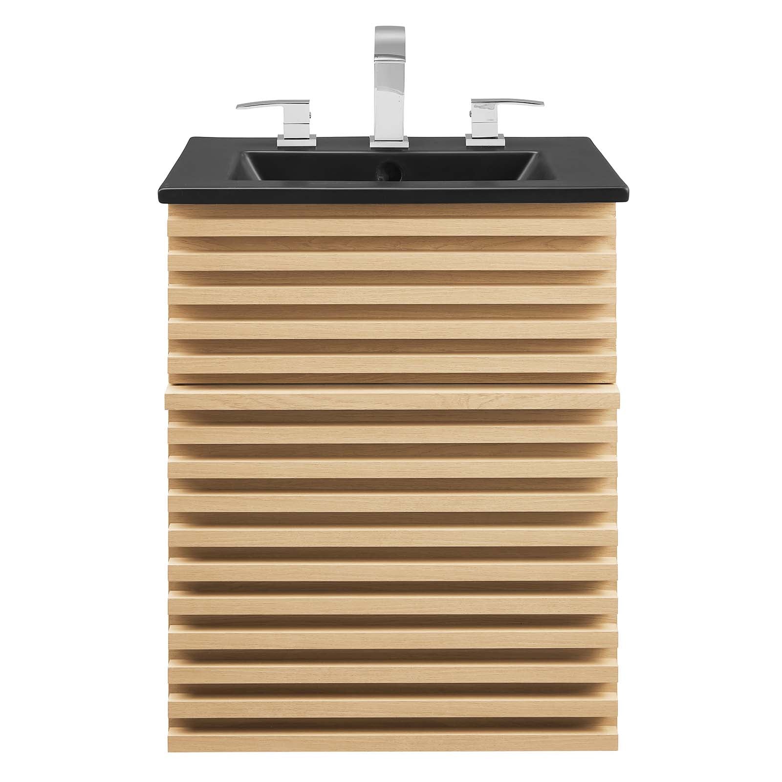 Tap into mid-century aesthetics with the Render Vanity. The Render 18" Bathroom Vanity features a durable MDF and particleboard frame with smooth walnut grain laminate, ample storage space in a full-extension drawer, and space-saving wall-mount design. Crafted with ceramic, a single sink with an integrated countertop, 8" centerset faucet holes, and rectangular sink basin continues the sleek look of this retro modern vanity. Clean lines and crisp design align for an edgy style designed to meet your needs. Boasting a mid-century modern style this vanity features a solid construction with a pleasing look and practical functionality. Assembly required and fixtures not included.