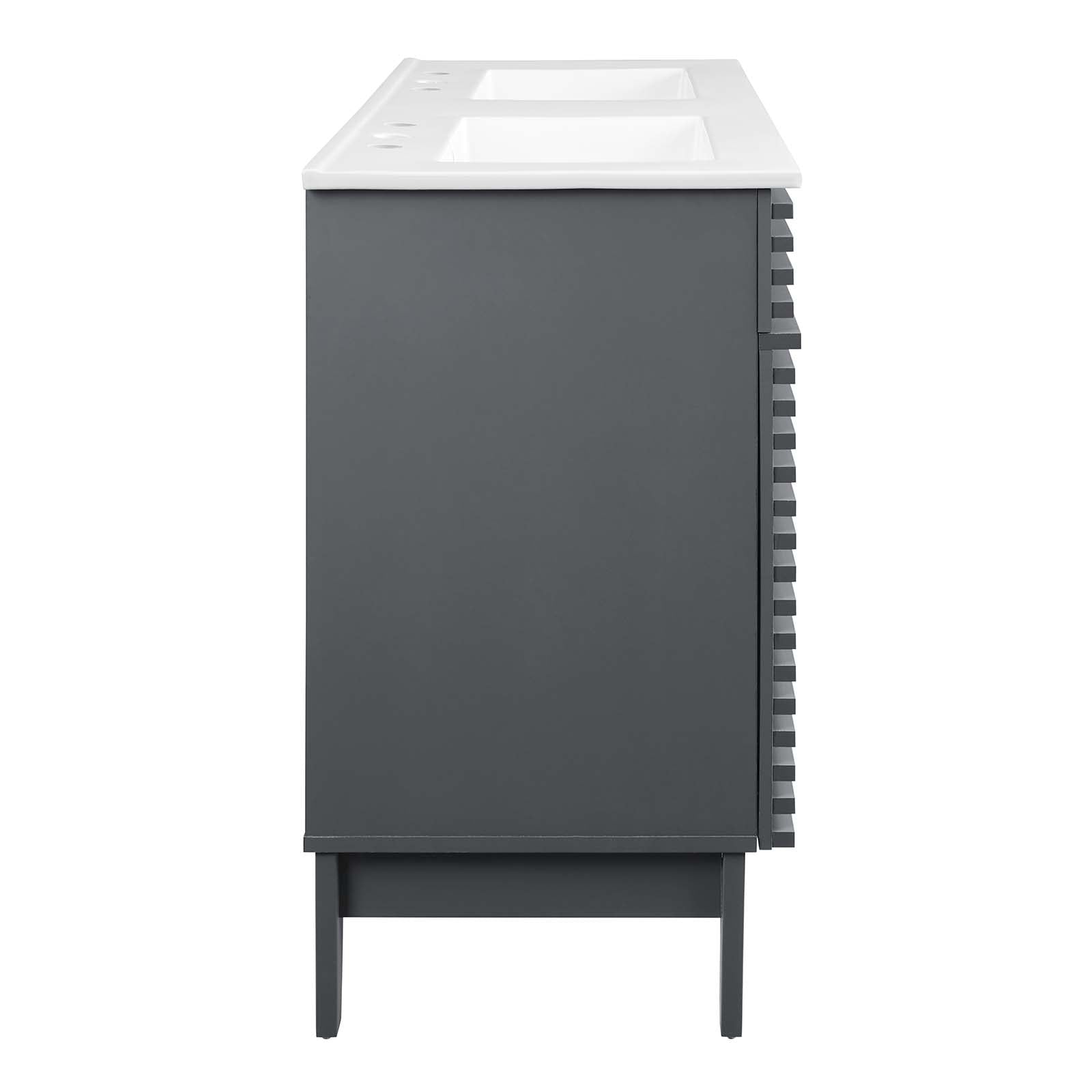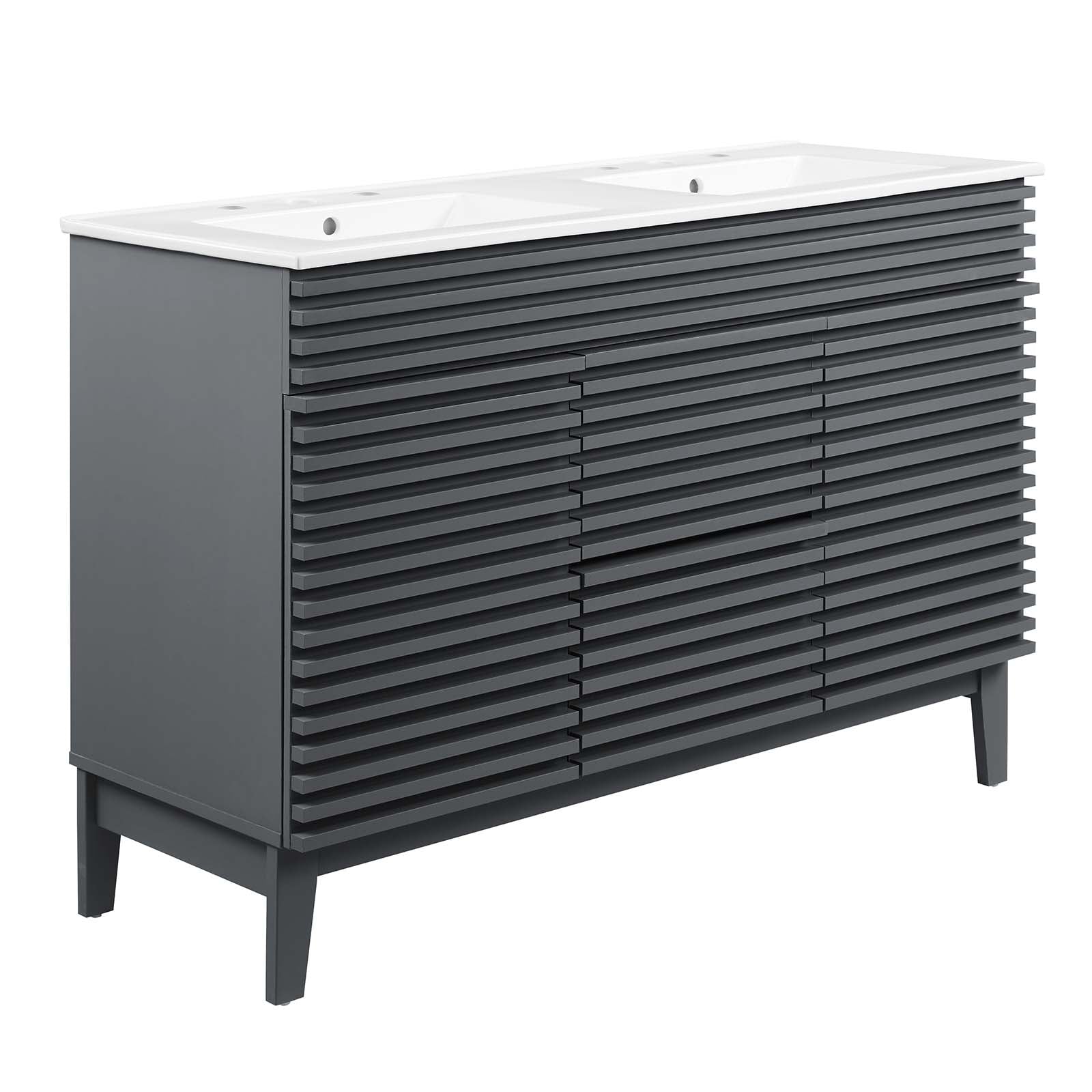 Tap into mid-century aesthetics with the Render Vanity. The Render 48" Bathroom Vanity features a durable MDF and particleboard frame with smooth walnut grain laminate, four tapered wood legs, and ample under sink storage space in full-extension drawers and behind soft-close hinged doors. Crafted with ceramic, a double sink with an integrated countertop, 8" centerset, and rectangular sink basins continue the sleek look of this retro modern vanity. Clean lines and crisp design align for an edgy style designed to meet your needs. Boasting a mid-century modern style this vanity features a solid construction with a pleasing look and practical functionality. This double sink has 8” between basins and 24” between basin sink holes. Assembly required and fixtures not included.