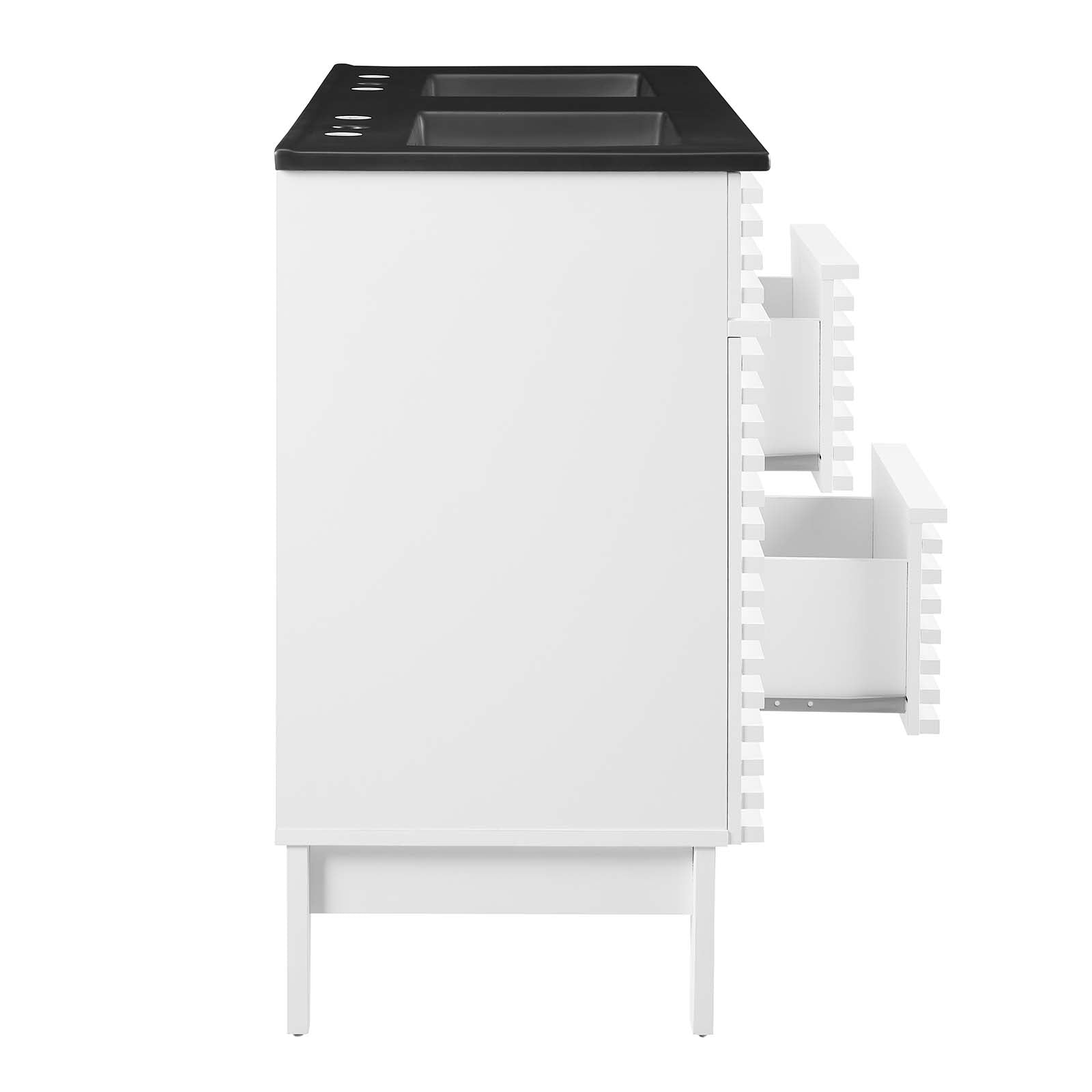 Tap into mid-century aesthetics with the Render Vanity. The Render 48" Bathroom Vanity features a durable MDF and particleboard frame with smooth walnut grain laminate, four tapered wood legs, and ample under sink storage space in full-extension drawers and behind soft-close hinged doors. Crafted with ceramic, a double sink with an integrated countertop, 8" widespread faucet holes, and rectangular sink basins continues the sleek look of this retro modern vanity. Clean lines and crisp design align for an edgy style designed to meet your needs. Boasting a mid-century modern style this vanity features a solid construction with a pleasing look and practical functionality. This double sink has 8” between basins and 24” between basin sink holes. Assembly required and fixtures not included.