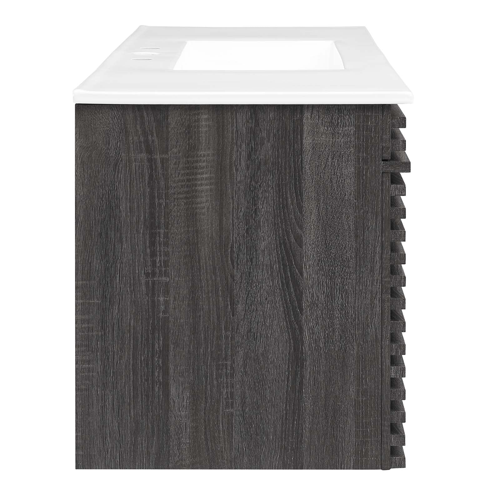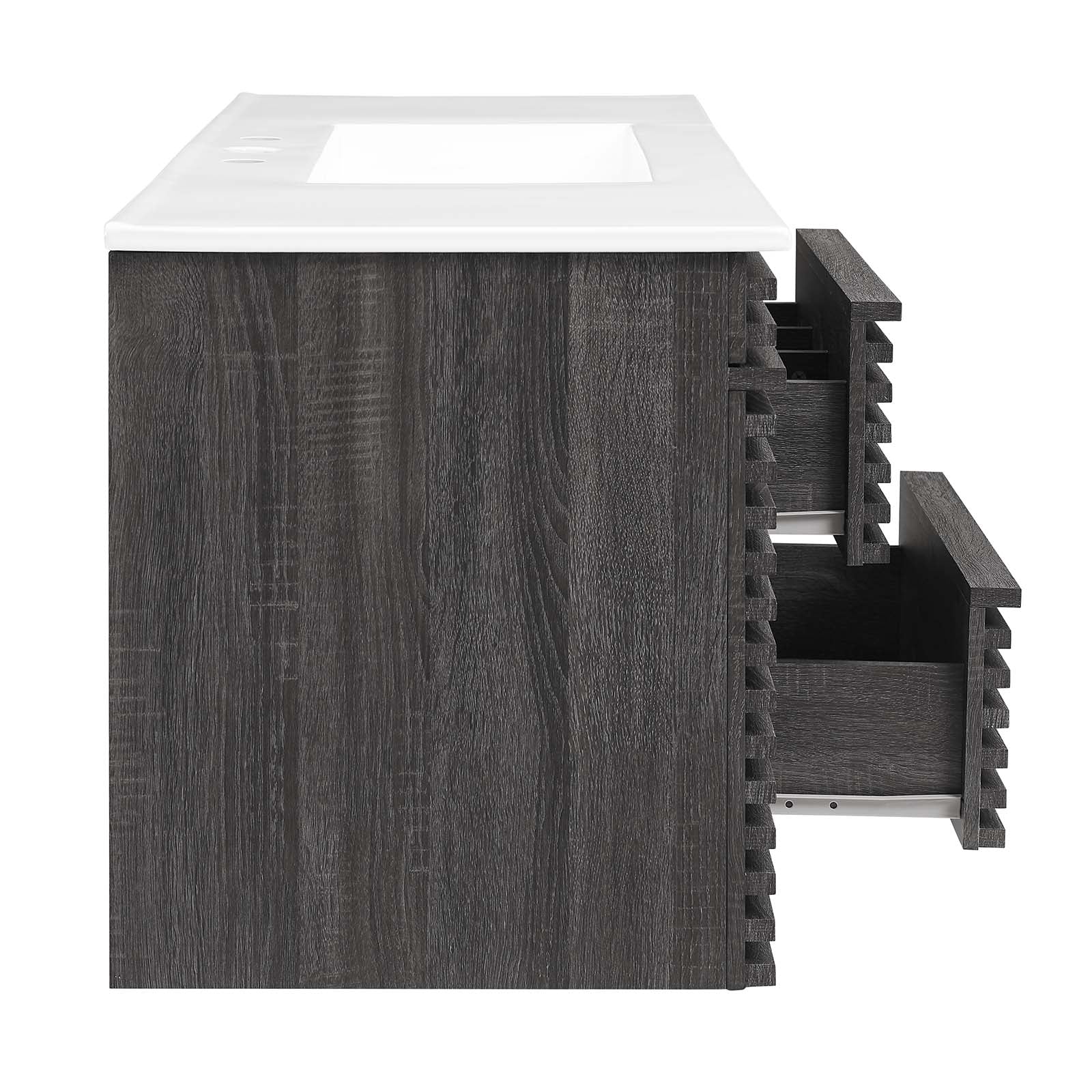 Tap into mid-century aesthetics with the Render Vanity. The Render 48" Single Sink Bathroom Vanity features a durable MDF and particleboard frame with a smooth laminate, ample storage space in two full-extension drawers, adjustable shelves behind soft-close hinged doors, and a space-saving wall-mount design. A curved ceramic basin with an integrated countertop and 8" centerset faucet holes creates sleek lines and a crisp design for an edgy look designed to meet your needs. Boasting a mid-century modern style this vanity features a solid construction with a pleasing look and practical functionality. Assembly required. Fixtures not included.