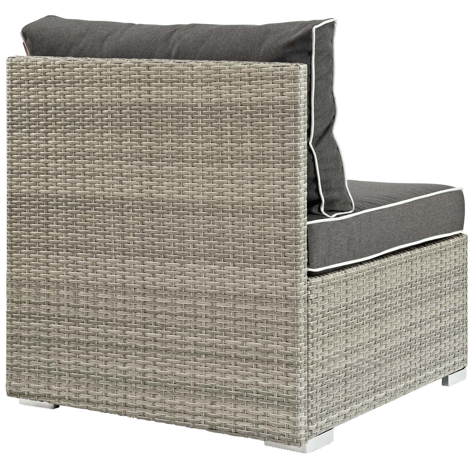 Enjoy the outdoors while benefiting from style and comfort of the Repose Outdoor Patio Furniture Series. Repose Patio Armless Sectional Sofa Chair offers a detailed tan and gray synthetic rattan weave with UV protection for eye-catching appeal and durability, plush 4” thick all-weather polyester cushions with contrasting color French piping, non-marking foot pads, and a sturdy powder-coated aluminum frame that supports up to 331 pounds. Subtle style defines the Repose outdoor sectional collection making it a natural choice for enhancing your patio, backyard, or poolside gatherings. This installment of the series is an outdoor patio armless chair.