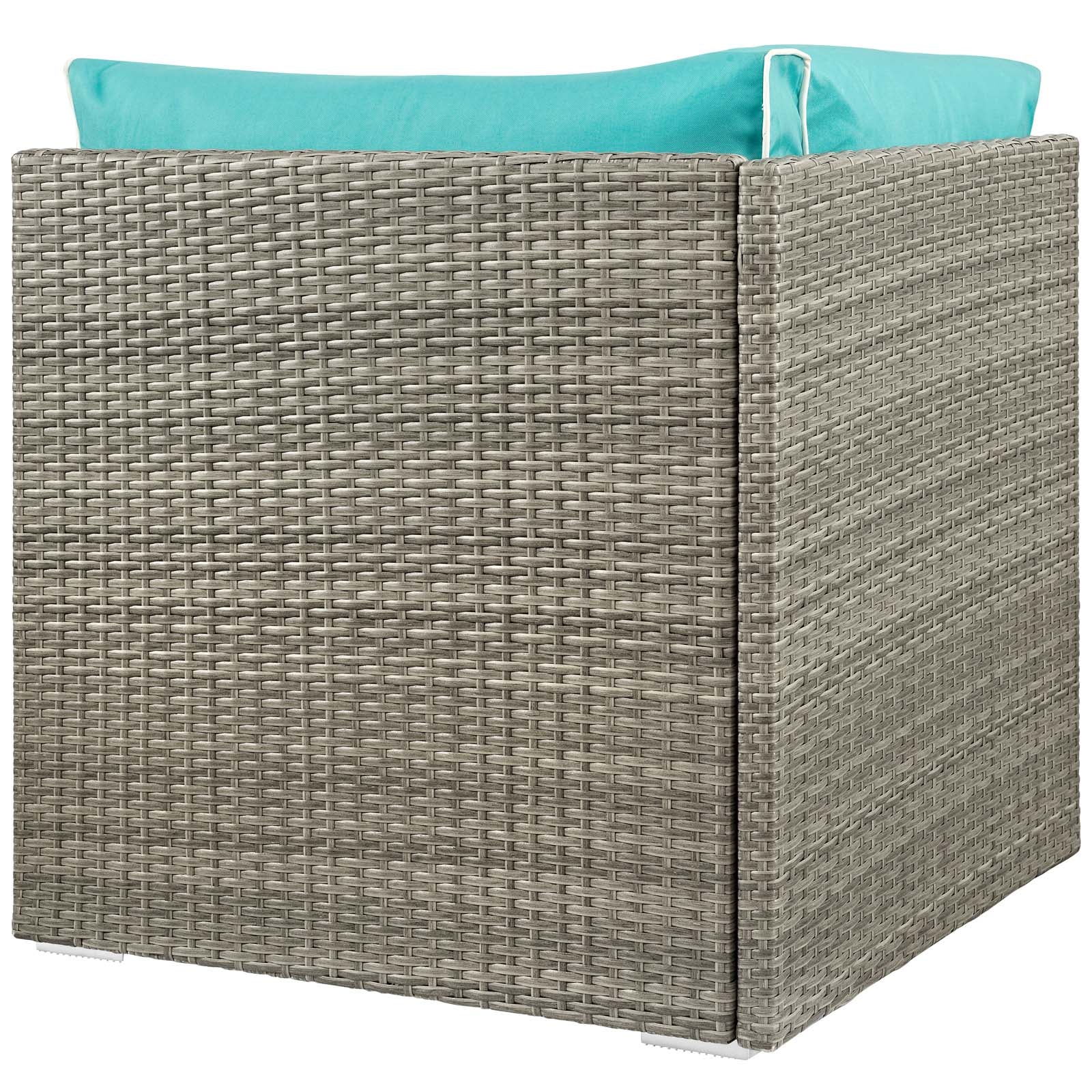 Enjoy the outdoors while benefiting from style and comfort of the Repose Outdoor Patio Furniture Series. Repose Patio Corner Sofa Chair offers a detailed tan and gray synthetic rattan weave with UV protection for eye-catching appeal and durability, plush 4” thick all-weather polyester cushions with contrasting color French piping, non-marking foot pads, and a sturdy powder-coated aluminum frame that supports up to 331 pounds. Subtle style defines the Repose outdoor sectional collection making it a natural choice for enhancing your patio, backyard, or poolside gatherings. This installment of the series is a patio corner sofa chair.