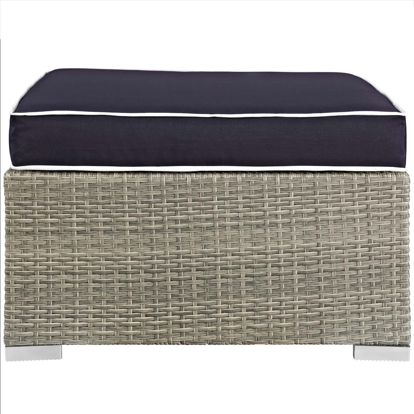Enjoy the outdoors while benefiting from style and comfort of the Repose Outdoor Patio Furniture Series. Repose Patio Ottoman offers a detailed tan and gray synthetic rattan weave with UV protection for eye-catching appeal and durability, plush 4” thick all-weather polyester cushions with contrasting color French piping, non-marking foot pads, and a sturdy powder-coated aluminum frame that supports up to 331 pounds. Subtle style defines the Repose outdoor sectional collection making it a natural choice for enhancing your patio, backyard, or poolside gatherings. This installment of the series is an outdoor patio ottoman.