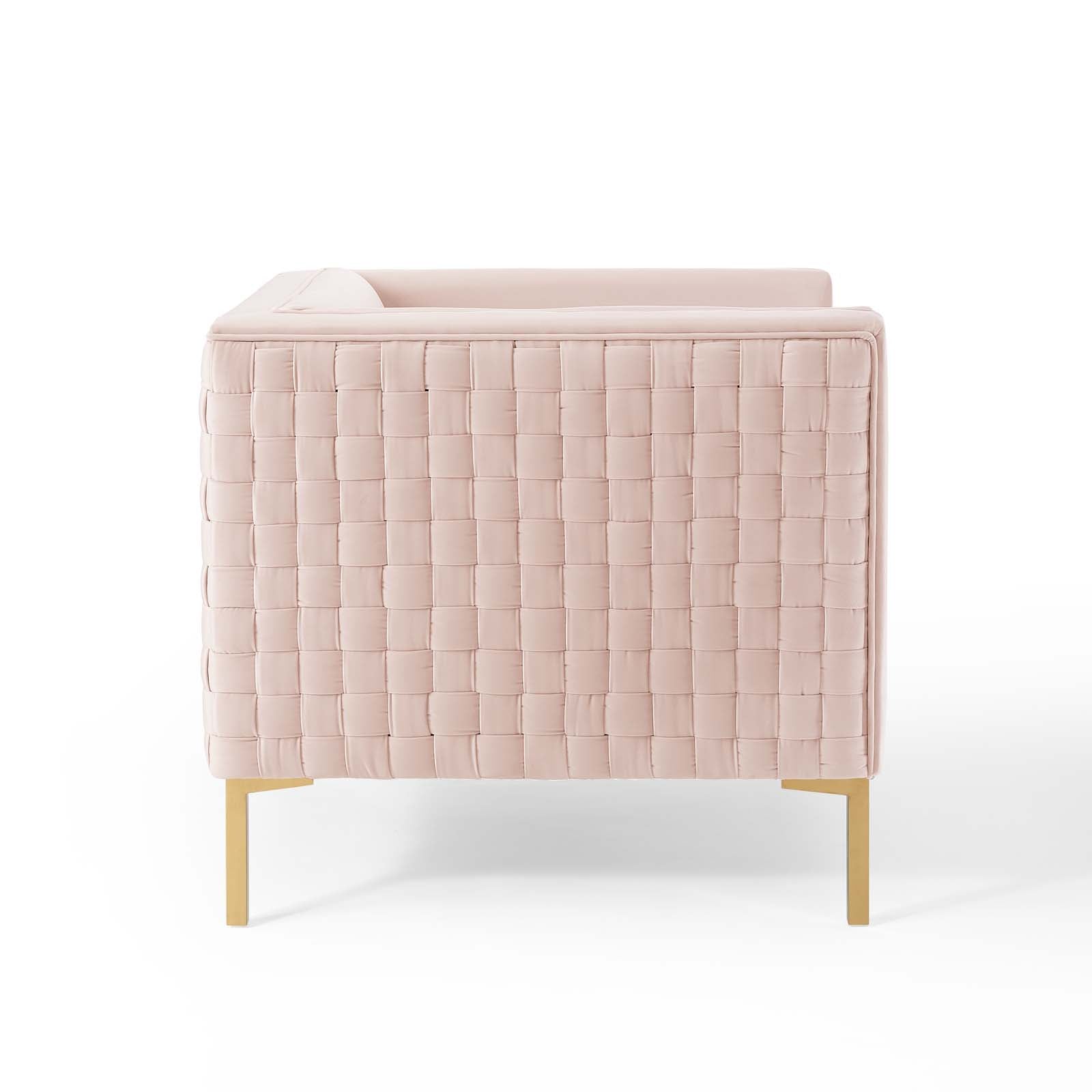 Pull the vintage energy of the Resonate Performance Velvet Upholstered Accent Armchair into your living room decor. The Resonate Accent Chair has a glam deco checkered motif with an exterior woven pattern. Dense foam padding and an individually wrapped spring coil system create a luxurious accent chair covered in soft and durable stain-resistant performance velvet polyester upholstery. This retro modern living room chair is solidly constructed from wood and plywood with four brushed gold stainless steel tapered legs capped with non-marking foot pads. No Assembly Required. Chair Weight Capacity: 441 lbs.