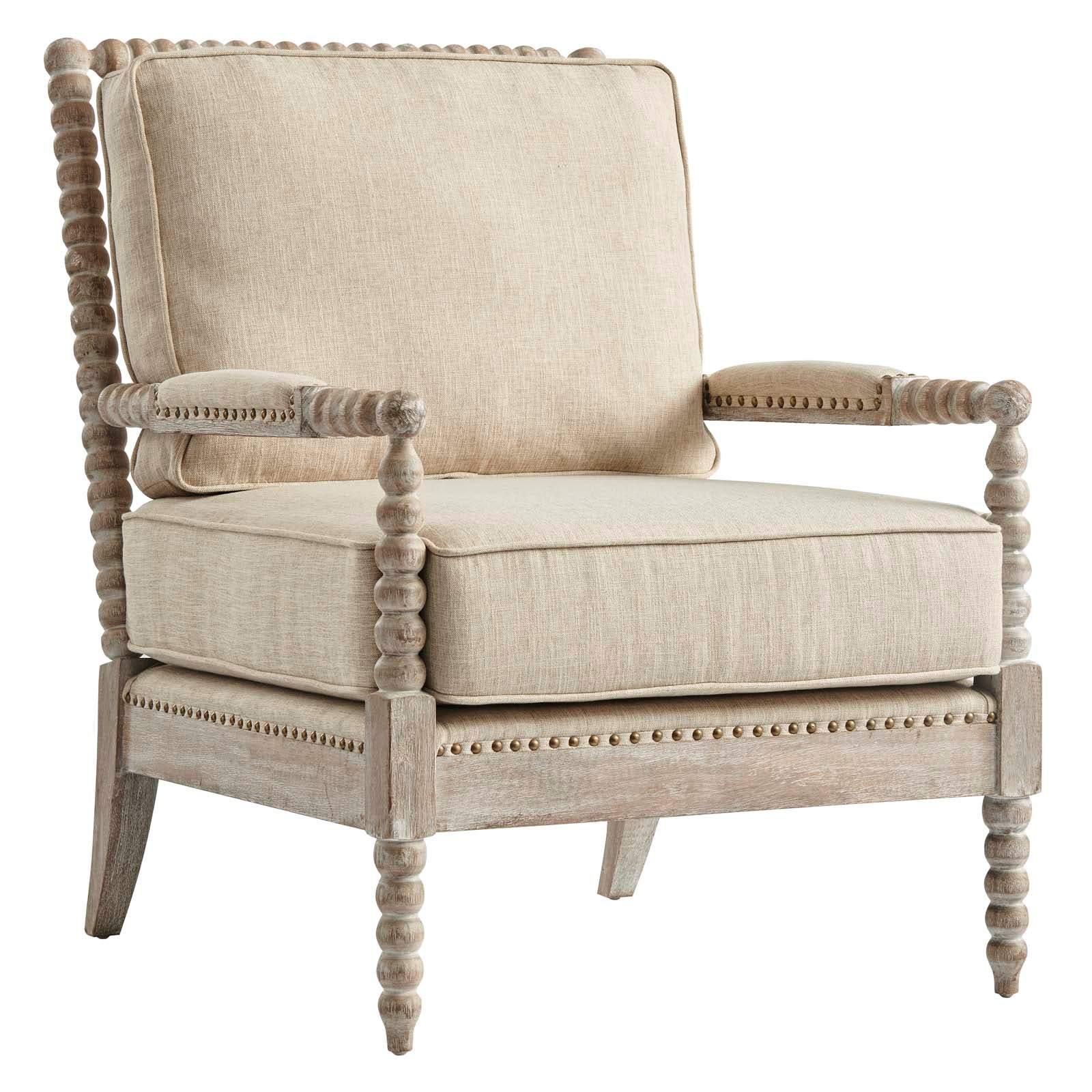 Find calm with the Revel Fabric Upholstered Armchair. With a distressed solid wood spindle frame, plush oversized seat and back cushions, polyester fabric upholstery, padded armrests, bronze nailhead trim, and non-marking foot caps, Revel harmoniously blends the most charming elements of coastal and cottage design. Perfect for modern farmhouse, transitional, or modern living and lounge spaces, make this quintessentially peaceful piece your own for long hours of quiet reflection and leisure. Weight Capacity: 330 lbs.