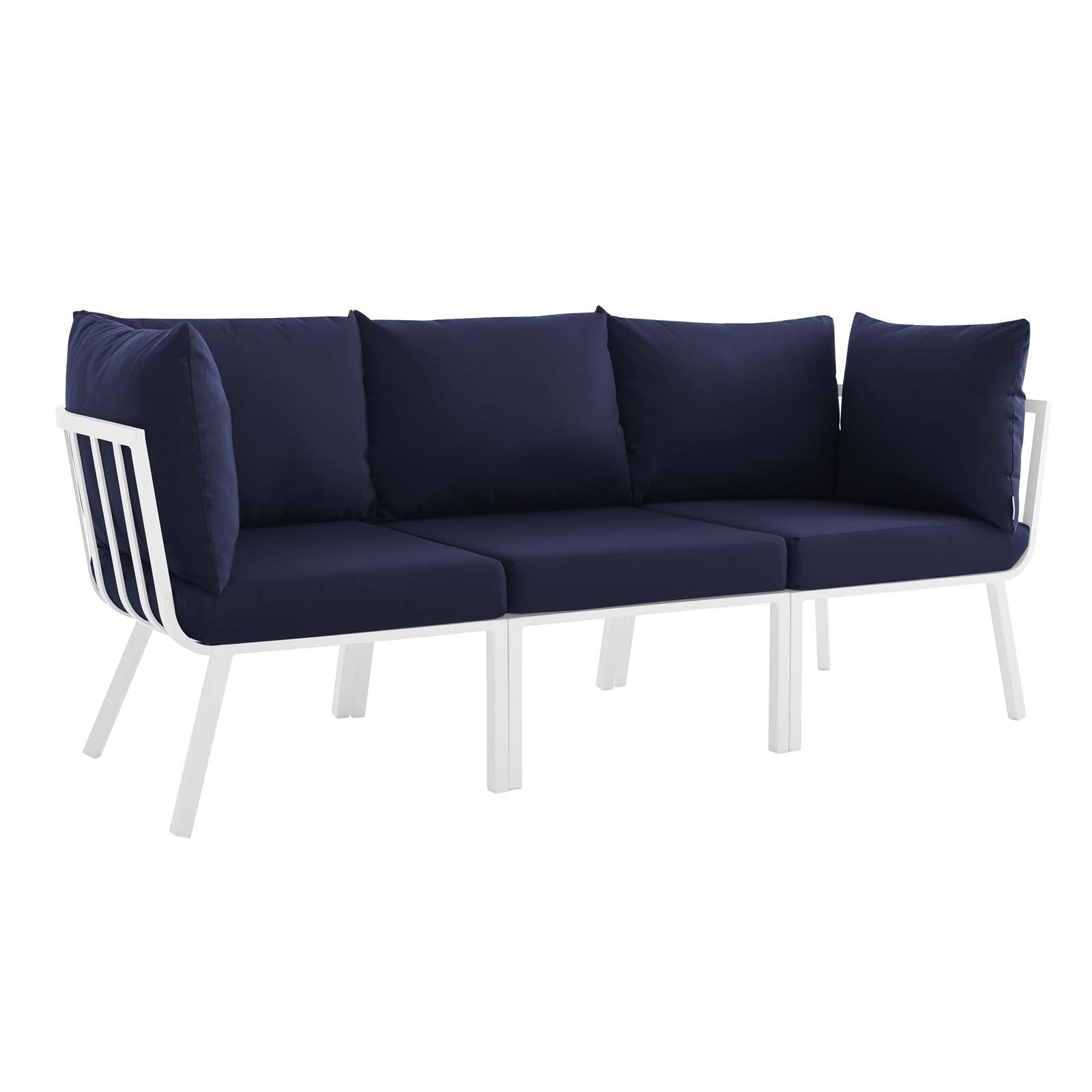 Refresh your outdoor decor with the Riverside Outdoor Patio Aluminum Sofa. Defined by a crisp, coastal style, this installment of the Riverside outdoor sectional sofa furniture collection features an open slatted back design, angled back legs, and plush 4" thick all-weather UV-resistant fabric cushions. Solidly constructed with a powder-coated aluminum frame, the Riverside outdoor sofa will enhance the look of your patio, backyard, balcony, porch, deck, or poolside area. Includes foot caps. Seat Weight Capacity: 300 lbs