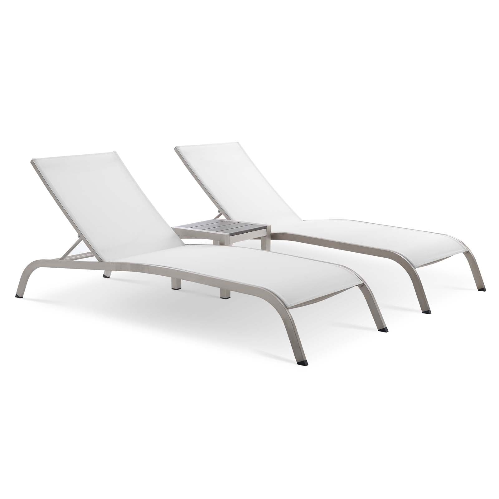 Energize your patio decor with the versatile vintage glamour Savannah Outdoor Patio Mesh Chaise Lounge Chair Set with Side Table. A sleek design that evokes a retro-modern feel, Savannah chaise lounge chairs feature all-weather Textilene mesh fabric that creates a breathable fabric for a pleasant outdoor lounging experience. Complete with an anodized matte aluminum frame with non-marking foot caps, these deceptively simple pieces create an aura of vintage glamour in your patio decor. This set of elegant outdoor sun loungers is a perfect addition to the backyard, poolside, porch, deck, or balcony.