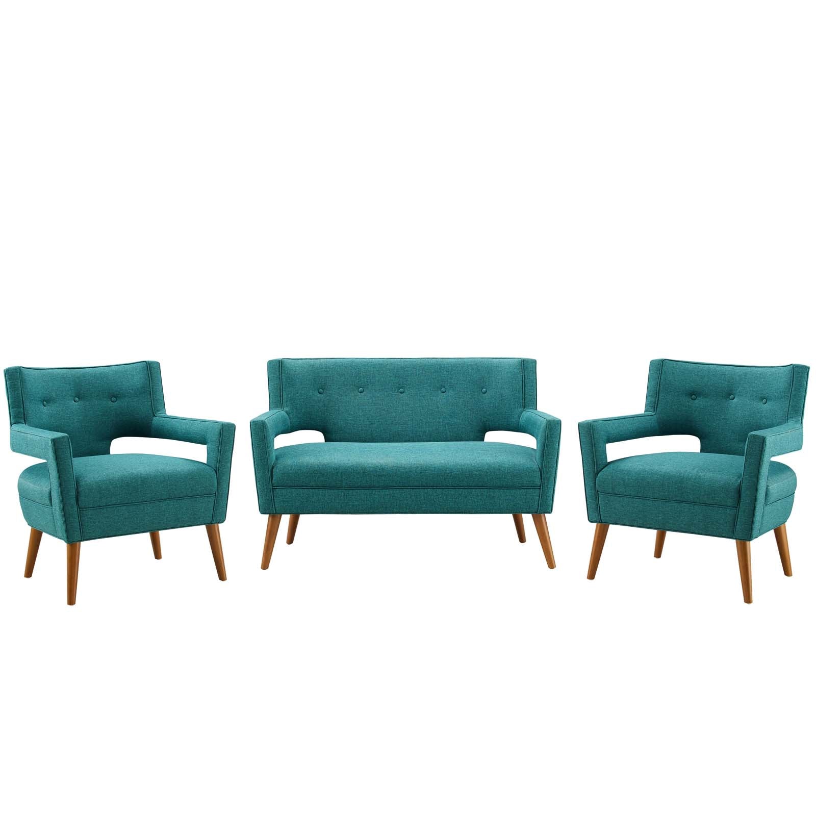 Carefully crafted simplicity and subtle sophistication blend to create the crafted simplicity of Sheer. A mid-century modern Loveseat and 2 Armchair Set upholstered in soft polyester fabric, Sheer features a streamlined profile and flared armrests for a striking silhouette. Complete with elegant button tufting and subtle piped trim, Sheer comes with dense foam padding positioned on a sinuous spring support system for exceptional comfort. Outfitted with tapered and splayed non-marking, cherry-stained wood legs, the Sheer Upholstered Fabric Loveseat and 2 Armchair Set delivers the perfect seating area for the living room, or home office.