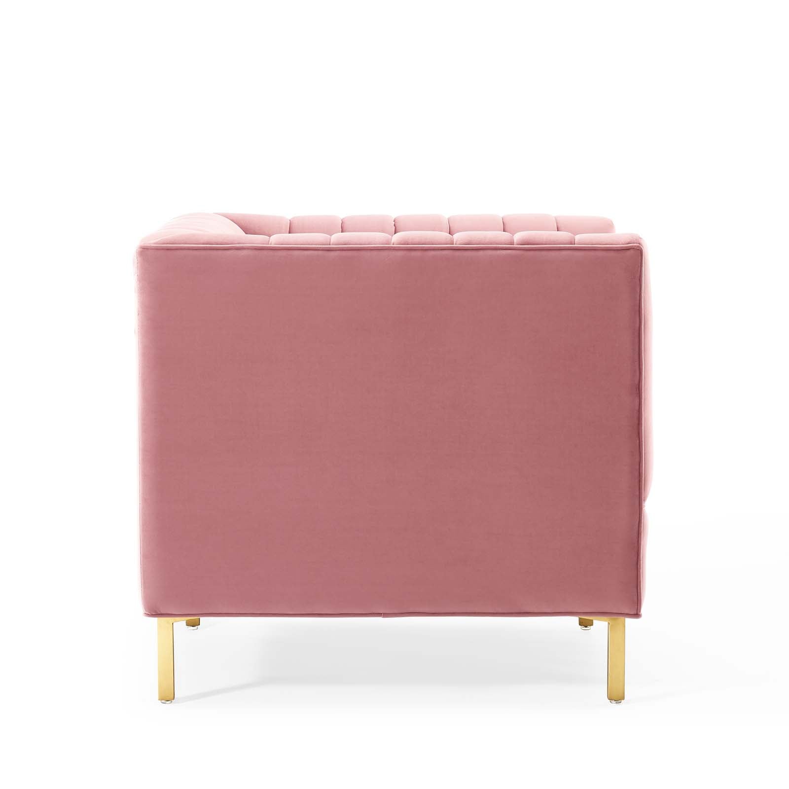 Engage the flowing lines of the Shift Channel Tufted Performance Velvet Living Room Accent Armchair for a subtle elegance that enhances living room decor. Shift features interior vertical channel tufted details that add visual depth to the glam deco accent chair. Luxuriously soft and stain-resistant performance velvet upholstery covers this living room chair for an elegant piece at home in your living room, lounge room, or office seating area. The Shift Velvet Chair rests securely on four gold stainless steel legs with non-marking foot pads to protect flooring. Assembly Required. Chair Weight Capacity: 441 lbs.