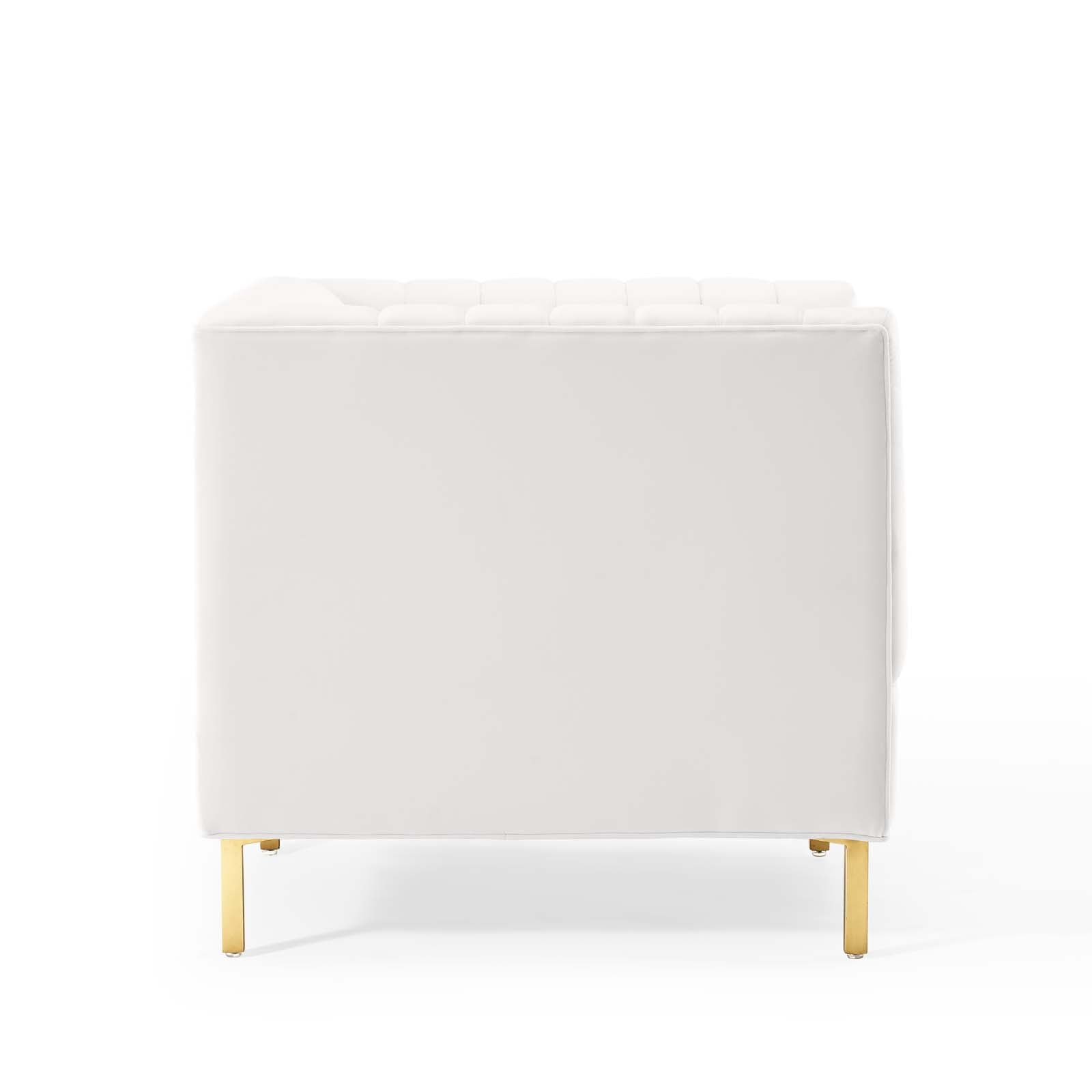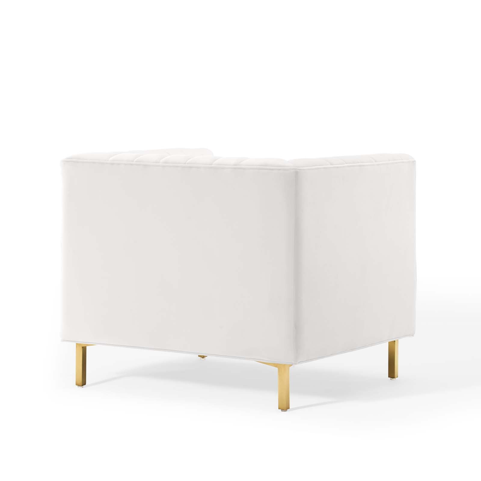 Engage the flowing lines of the Shift Channel Tufted Performance Velvet Living Room Accent Armchair for a subtle elegance that enhances living room decor. Shift features interior vertical channel tufted details that add visual depth to the glam deco accent chair. Luxuriously soft and stain-resistant performance velvet upholstery covers this living room chair for an elegant piece at home in your living room, lounge room, or office seating area. The Shift Velvet Chair rests securely on four gold stainless steel legs with non-marking foot pads to protect flooring. Assembly Required. Chair Weight Capacity: 441 lbs.