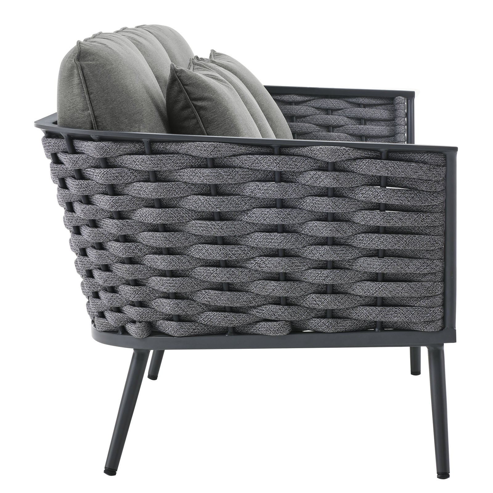Gather family and friends for pleasant weather and good conversation with the Stance Outdoor Collection. Boasting a contemporary modern look, Stance features woven polyester fabric rope seat back and flared powder-coated aluminum frame, slatted synthetic wood tabletops, and waterproof all-weather fabric cushions with plush 5" thick, dense foam padding provide a relaxing spot to lounge. A versatile set designed for long-lasting durability, each piece in the Stance Collection can be mixed and matched and effortlessly arranged to fit the spontaneous needs of you and your guests. Cushion Thickness: 5"H. Chair Weight Capacity: 331 lbs. / Sofa Weight Capacity: 551 lbs.