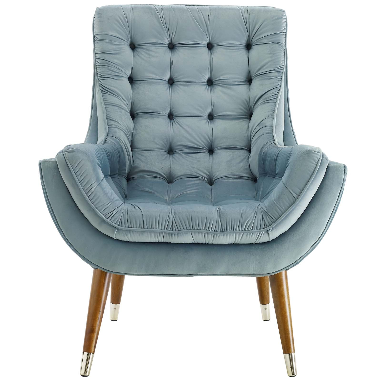 Upgrade your leisure time with the elegance and luxury of Suggest Performance Velvet Lounge Chair. Upholstered in stain-resistant performance velvet, Suggest delivers sophistication with deep button-tufting, flared armrests, and splayed wood legs with gold metal sleeves. The rich texture of this armchair is soft to the touch, while plush dense foam cushion padding, a deep seat pocket, non-marking foot caps, and gentle recline, provide unparalleled support while reading, resting, relaxing, or conversing. A chic mid-century inspired accent or lounge chair for the living room, bedroom or reading nook, Suggest makes a supremely comfortable addition to the modern home. Chair Weight Capacity: 331 lbs.