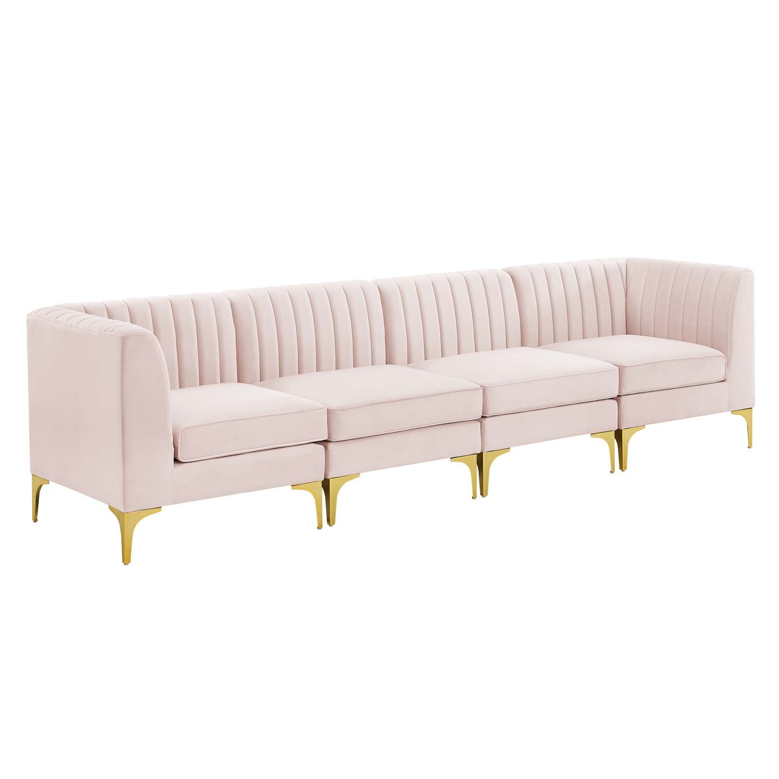 Elevate your living space with the visual appeal and linear detail of the Triumph Channel Tufted Performance Velvet Sofa. With interior channel tufting and luxe velvety texture, this sofa abounds in retro modern style and glam deco charm. This couch is part of a sectional sofa collection that allows you to create a seating solution that works for your living room, bedroom, office space, entryway, or lounge area. This upholstered sectional sofa is covered in stain-resistant performance velvet and features dense foam padding and a sinuous spring support system for a premium seating experience. The velvet sofa sits on gold metal legs with non-marking foot caps to protect your flooring. Weight Capacity for Each Sectional Sofa Piece: 440 lbs.