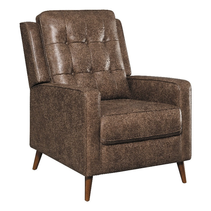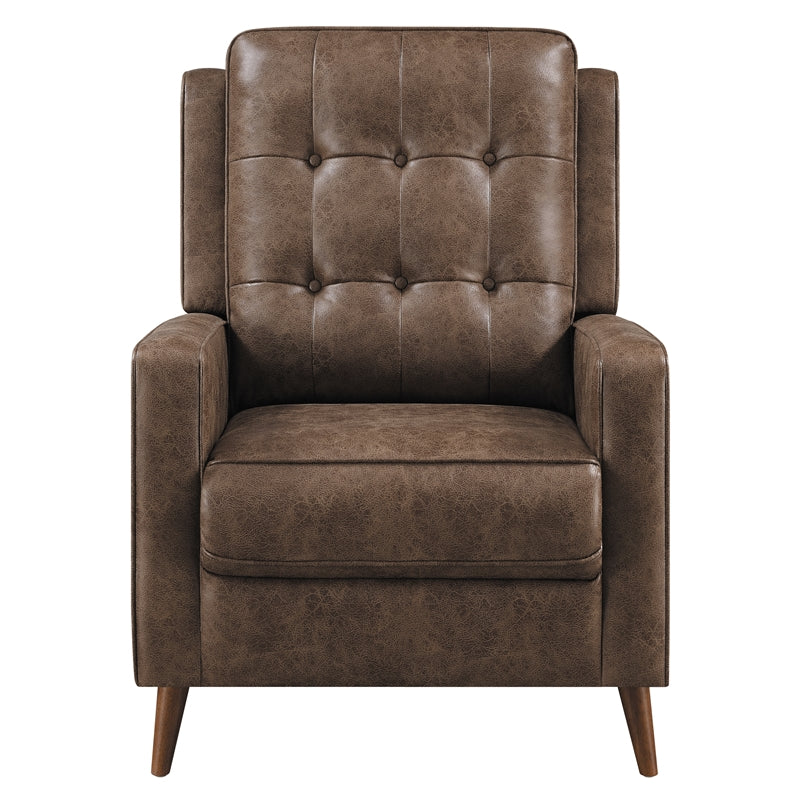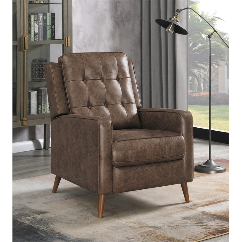 Covered in a brown Performance microfiber that gives a leather-like appearance, this mid-century modern recliner boasts style and functionality. Designed as a manual push back recliner, it blends into a seating arrangement discreetly and with grace. A tall angled backrest with button tufting offers a classical look and invites one to kick back and relax. Tailored, narrow armrests cradle you and lend a Tuxedo-style flair. Situated on flared and tapered legs in a brown finish, this chair gives a space retro-inspired vibes and modern sensibilities for total relaxation.