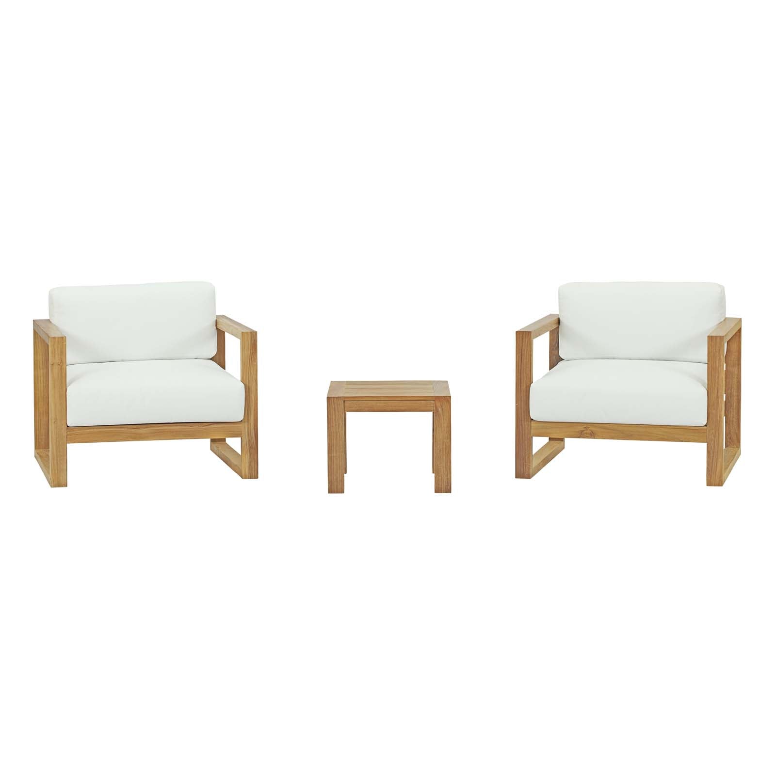 Refresh your outdoor décor with the Upland Teak Outdoor Collection. Boldly designed with eye-catching appeal, Upland is made of solid teak wood with all-weather white cushions and solidly build construction. The perfect choice for balconies, backyards, patios, gazebos, poolside or garden spaces, choose from matching armchair, loveseat, ottoman, side table, coffee table, and chaise lounge selections with this multi-purpose modern teak set. Known for its ability to withstand extreme weather conditions, teak is the wood selection of choice for long-lasting outdoor furnishings. Assembly required.