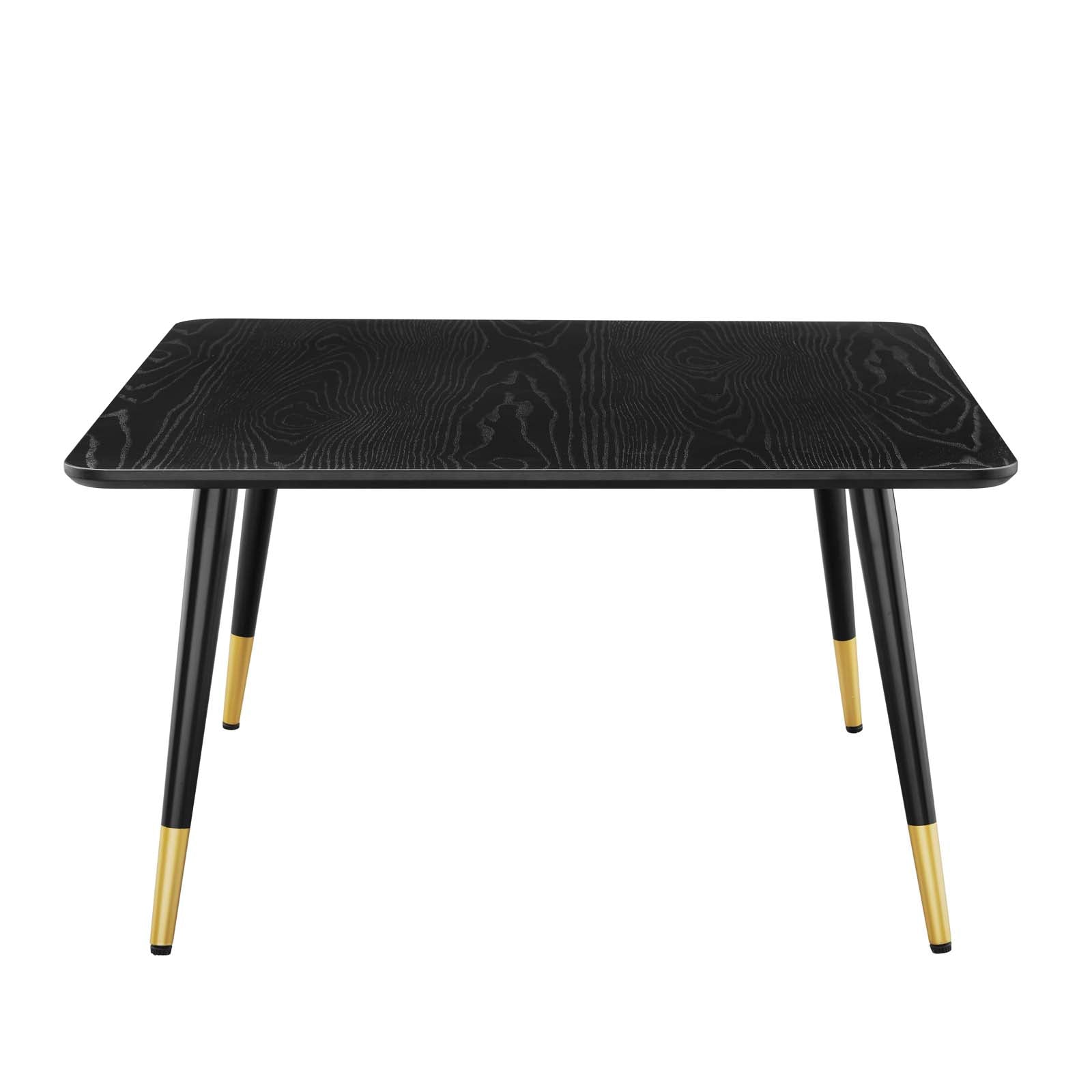 Bring modern influence to your living space with the deliberate style of the Vigor Square Coffee Table. Reflecting a seamless organic shape, this square coffee table sits atop four splayed iron legs with gold metal sleeves that bring a glamorous flair to the mid-century modern silhouette. This piece of living room furniture features a MDF tabletop embossed with matte black lacquer for a dark, striking look. Includes adjustable-height foot caps. Assembly required.